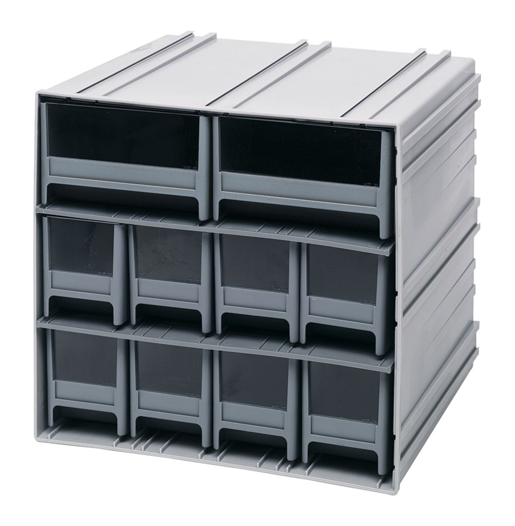 Cabinet^ Interlocking Storage Cabinets made of Highimpact polystyrene, can interlock vertically or horizontally to crate a modular system, with 7 divider slots, Outside dimension: 11 3/8 Dx11 3/4 Wx11 H Inch, with 8 drawers 11 x2 3/4 x3 5/16 inch and 2 drawers11 x5 5/8 x3 5/16 inch, Color: Gray