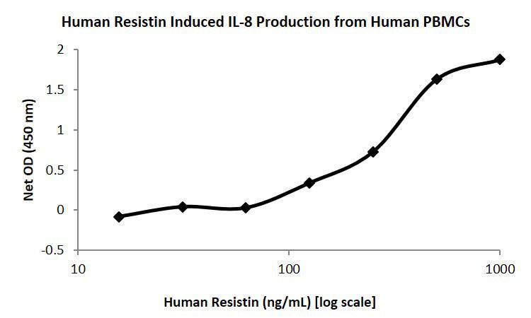 Human Resistin Dimer, Non-Glycosylated Recombinant^ Human Resistin Dimer, Non-Glycosylated Recombinant Protein, Two Identical 93 Amino Acid Monomers And 20 Kda, Source: E. Coli, Purity: >/=95% (Hplc, Reducing And Non-Reducing Sds-Page, Uv Spectroscopy At 280 Nm), Synonymns: Fizz3, Adsf, Size: 500Ug
