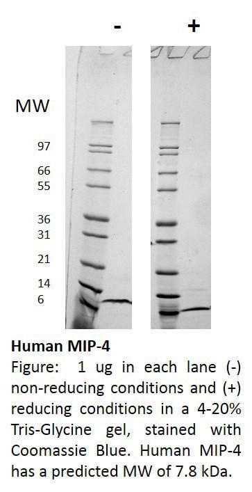 Human Macrophage Inflammatory Protein-4 Mip-4^ Human Macrophage Inflammatory Protein-4 Mip-4, Non-Glycosylated Recombinant Protein, 69 Aas, 7. 8Kda, Source: E. Coli, Purity: >/=98% Hplc, Reducing & Non-Reducing Sds-Page, Uv Spectroscopy At 280 Nm, Synonymn: Ccl18, Parc, Amac-1, Dc-Ck1, Size: 500Ug