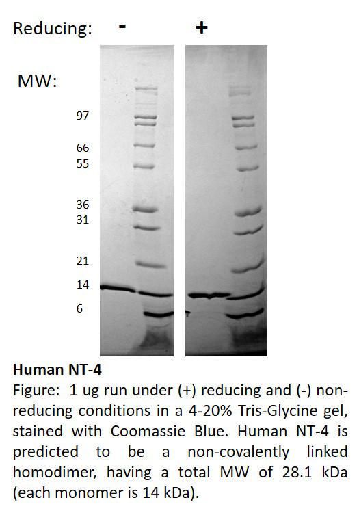 Human Neurotrophin-4 (Nt-4)^ Human Neurotrophin-4 (Nt-4), Non-Glycosylated Recombinant Protein, Two 131 Amino Acid Chains, 28. 1Kda, Source: E. Coli, Purity: >/=97% (Hplc, Reducing & Non-Reducing Sds-Page, Uv Spectroscopy At 280 Nm), Synonymns: Nt-4/5, Neurotrophin-5, Size: 500Ug