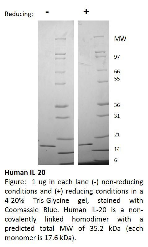 Human Interleukin-20 (Il-20)^ Human Interleukin-20 (Il-20), Non-Glycosylated Recombinant Protein, Two 153 Amino Acids, 35.2 Kda, Source: E. Coli, Purity: >/=95% (Reducing And Non-Reducing Sds-Page, Uv Spectroscopy At 280 Nm), Endotoxin Level: </= 1 Eu/Ug Protein, Size: 500Ug