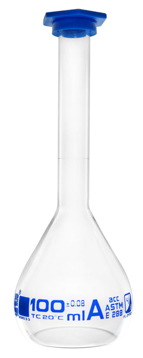 CLASS-A Capacity 100ml Tolerance ± 0.080ml Borosilicate glass with blue, graduation mark. Flask measures 6.5" tall, bottom diameter measures 2.25", top diameter measures 0.5". Fitted with snap cap. Class A, as per ASTM-E288.
