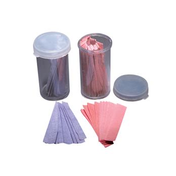 100 strips each in matching color plastic vials. Individual strips are approximately 2 " long and 1/4 " wide.