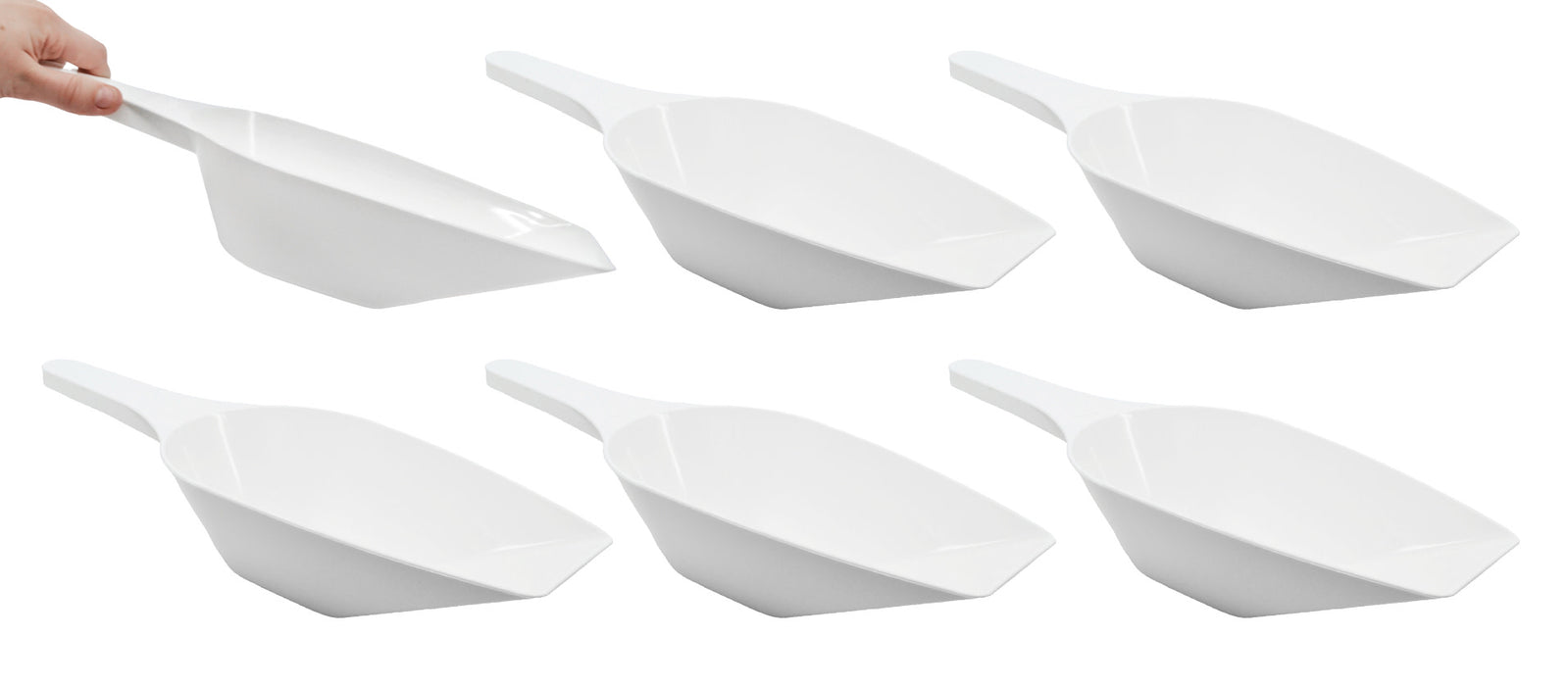 ull; POLYPROPYLENE || Scoop is made of high quality, heat and chemical resistant polypropylene plastic • 1000ML CAPACITY || Features a 1000ml capacity. Scoop has a flat bottom, which allows it to rest upright for weighing and filling • FLAT BOTTOM || Scoop has a flat bottom, which allows it to rest upright for weighing and filling • GREAT FOR CLASSROOM, SCIENCE LABORATORIES AND HOUSEHOLD || Designed for use in professional laboratories, but is an ideal choice for science classrooms and household use. Useful for restaurants and kitchens. Great for general scooping, transferring, measuring and weighing. • MANUFACTURED BY EISCO LABS || Eisco Labs proudly manufactures its own products using state-of-the-art equipment, and following the highest standards of quality control. Each product is carefully designed by a team of laboratory professionals and experienced engineers with quality and durability in mind Pack of 6 high quality, polypropylene plastic weighing scoops with a 1000ml (33.8oz) capacity. Capacity marked on scoop handle for easy identification. Autoclavable and dishwasher safe for easy cleaning. Handle is approximately 5.5" long. Scoop is 10" long, 5.75" wide and 3" deep.