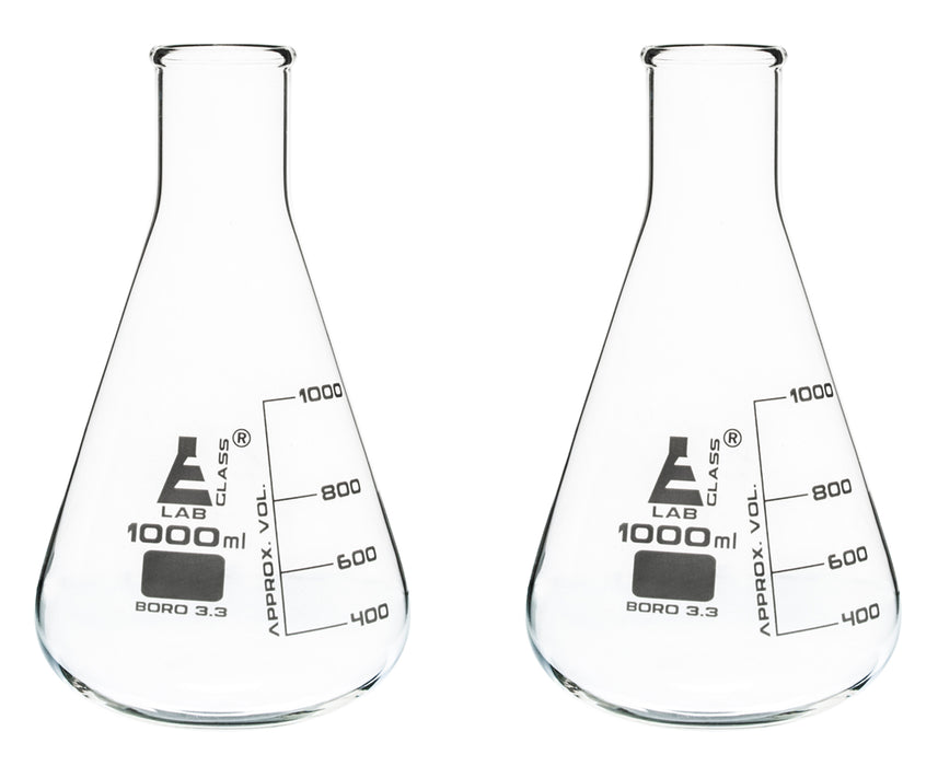 Here is the corrected text: This pack of two 1000mL Erlenmeyer flasks features narrow necks and is made of heavy-duty borosilicate 3.3 glass with excellent strength against breakage. Each flask has easy-to-read white enamel graduations every 200mL, a uniform wall thickness ideal for heating, and a reinforced rim to protect against high impacts. The flasks are microwavable and autoclavable, with superior chemical durability and heat tolerance, able to withstand high temperatures and thermal shocks. They conform to DIN ISO 1773 standards for narrow neck conical flasks, making them an ideal choice for professional laboratories, science classrooms, and household use. Eisco Labs borosilicate glass has the following heat tolerances: strain point 515°C, annealing point 565°C, and softening point 820°C.