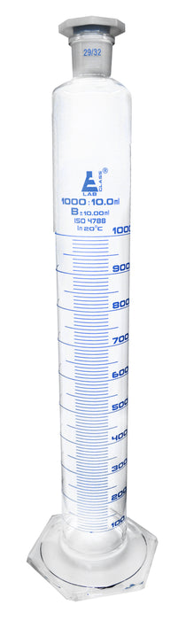Measuring Cylinder, fitted with an interchangeable 29/32 polypropylene stopper. Class B. Made of high quality borosilicate glass. 1000ml capacity, 10ml graduation lines, marked every 100ml. Blue graduations. Stands 20" tall, and has a base measuring 5.5". This cylinder has a hexagonal base for stability. Eisco Labs Borosilicate glass has the following heat tolerances: Strain Point -515°C | Annealing Point 565°C | Softening Point 820°C.