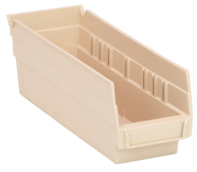 Shelf bin^ Shelf bin high ivory polypropylene, 11 5/8inx 4 1/8inx 4in, used to store small and large parts, while sitting on wire or steel shelving. molded-in label holder, built-in rear hanglock which allows bin to tilt out for complete access on shelving