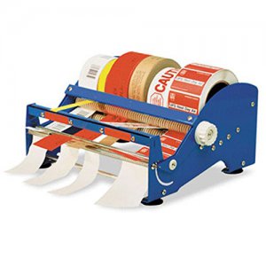 Table Top Tape and Label Dispensers hold multiple rolls of labels and specialty tapes. They are designed to load and unload rolls easily. Features include a steel frame for durability, gripper base for slip resistance, and a serrated blade to cut the tapes.