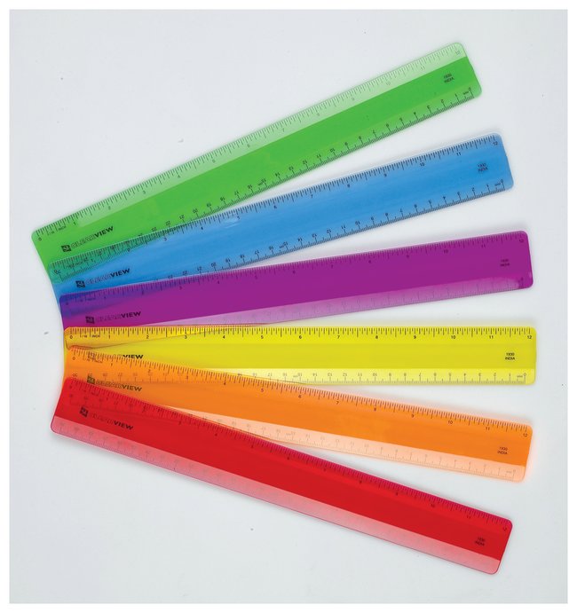 Inch and metric calibrationsClear ruler is shatterproofFlexible and clearview rulers are shatter-resistant; available in packs of 12 with two each of red, green, blue, orange, yellow and purple