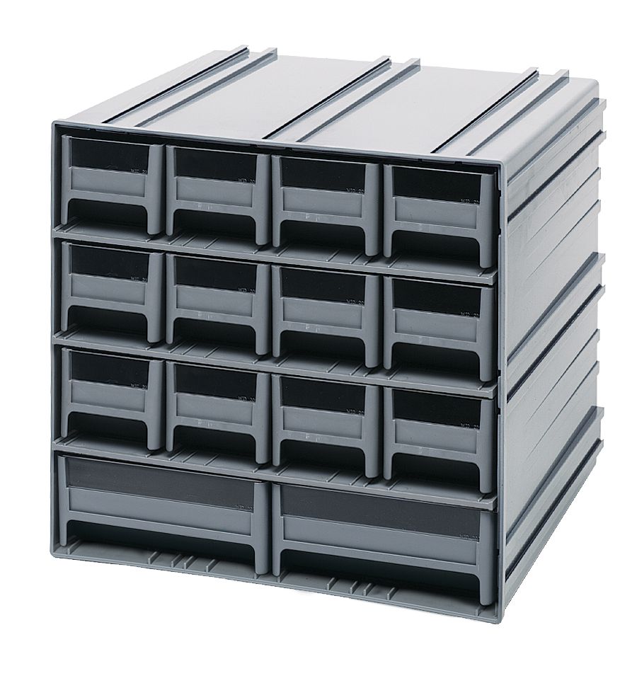 Cabinet^ Interlocking Storage Cabinets made of Highimpact polystyrene, can interlock vertically or horizontally to crate a modular system, with 7 divider slots, Outside dimension: 11 3/8 Dx11 3/4 Wx11 H Inch, with 12 drawers 11 x2 3/4 x2 1/2 Inch and 2 drawers 11 x5 5/8 x 2 1/2 Inch, Color: Gray