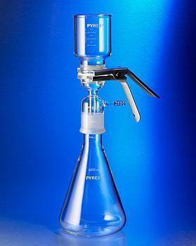 PYREX* 47 mm Microfiltration All-Glass Assembly^ Includes: 1000 mL funnel, 4L flask, 47 mm fritted all-glass support base, aluminum clamp. Units have coarse porosity frits, and accommodate 47 mm filters. The all-glass design ensures chemical compatibility with most organic solvents.