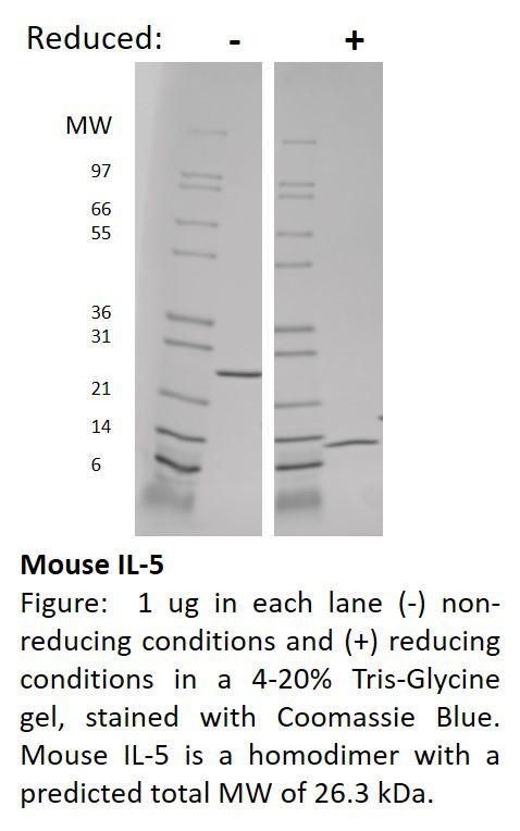 Recombinant, Mouse, Interleukin-5, Animal Free^ Recombinant, Mouse, Interleukin-5, Animal Free, Source: &Nbsp;&Nbsp;E. Coli, Purity: 97% Hplc, Reducing And Non-Reducing Sds-Page, At 280 Nm, Non-Glycosylated, Disulfide-Linked Homodimer, Two 113 Aa Chains, 26.2 Kda, Synonyms: &Nbsp;Edf, &Nbsp;Bcdfii, &Nbsp;Trf, Size: 500Ug