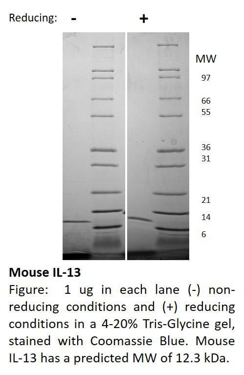 Recombinant, Mouse, Interleukin-13^ Recombinant, Mouse, Interleukin-13, Source: &Nbsp;&Nbsp;Escherichia Coli, Purity: Greater Than Or Equal To 95% As Determined By&Nbsp; Reducing & Non-Reducing Sds-Page, At 280 Nm, Non-Glycosylated&Nbsp;Protein, Containing 111 Amino Acids, 12. 3&Nbsp;Kda, Synonyms: &Nbsp;Nc30, Size: 500Ug