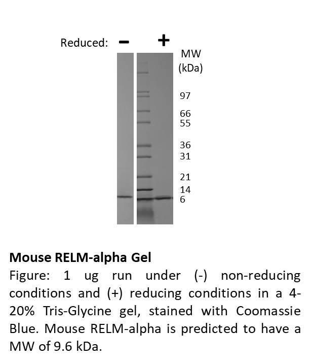 Mouse Resistin-Like Molecule-Alpha/Relm-Alpha, Non-Glycosylated Recombinant^ Mouse Resistin-Like Molecule-Alpha/Relm-Alpha, Non-Glycosylated Recombinant Protein, 88Aa 10Kda, Source: E.Coli, Purity: >/=98%, Reducing And Non-Reducing Sds-Page, Uv Spectroscopy At 280 Nm, Synonymn: Fizz1, Size: 500Ug