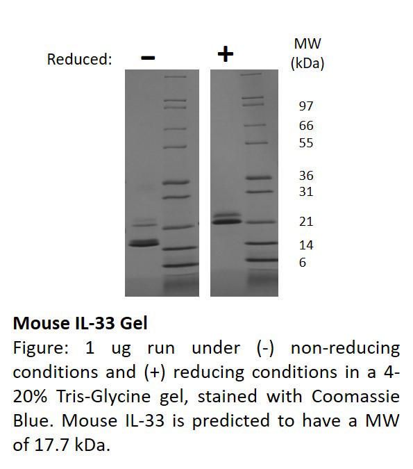 Mouse Interleukin-33 (Il-33)^ Mouse Interleukin-33 (Il-33), Non-Glycosylated Recombinant Protein, 159 Amino Acids, 17.7 Kda, Source: E. Coli, Purity: >/=90% As Determined By Reducing & Non-Reducing Sds-Page, Endotoxin Level: </= 1 Eu/Ug Protein, Synonymns: Np-Hev, Size: 500Ug