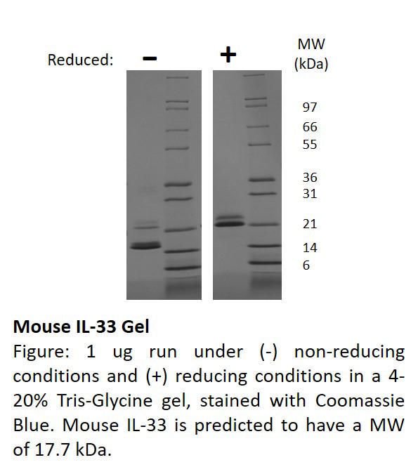 Mouse Interleukin-33 (Il-33)^ Mouse Interleukin-33 (Il-33), Animal Free (Af), Non-Glycosylated Recombinant Protein, Containing 159 Amino Acids, 17.7 Kda, Source: E. Coli, Purity: >/=90% As Determined By Reducing And Non-Reducing Sds-Page, Synonymns: Np-Hev, Size: 500Ug