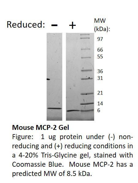 Mouse Monocyte Chemoattractant Protien 2^ Mouse Monocyte Chemoattractant Protien 2, Non-Glycosylated Recombinant Protein, 74 Amino Acids And 8.5 Kda, Source: E. Coli, Purity: >/=98%, Synonymns: Ccl8, Hc14, Size: 500Ug