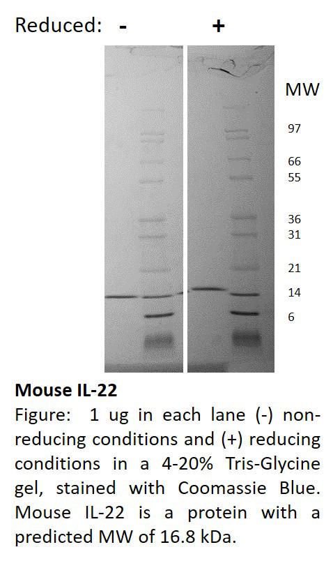 Mouse Interleukin-22 (Il-22)^ Mouse Interleukin-22 (Il-22), Non-Glycosylated Recombinant Protein, Containing 147 Amino Acids, 16.8 Kda, Source: E. Coli, Purity: 95% As Determined By Reducing And Non-Reducing Sds-Page< 0.05 Eus/Ug Protein, Synonymns: Il-Tif, Size: 500Ug