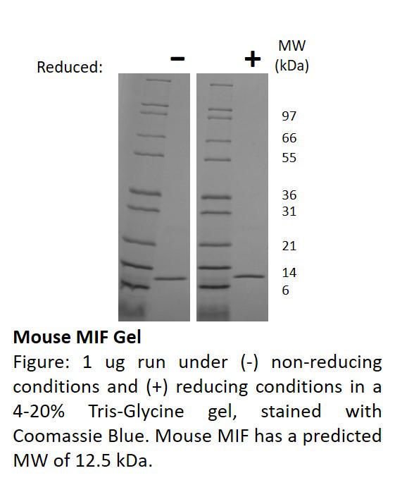 Mouse Mif, Recombinant^ Mouse Mif, Recombinant Protein, Non-Glycosylated, Containing 115 Amino Acids, With A Molecular Weight Of 12.5 Kda, Source: E. Coli, Purity: 95% As Determined By Reducing & Non-Reducing Sds-Page, Endotoxin Level: Typically Less Than 0.05 Eus/Ug Protein, Size: 25Ug