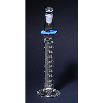 Borosilicate glass cylinders with pour spouts feature heavy uniform wall tubing and strong, stable hexagonal bases and a glass stopper. All cylinders come with bumper guards. Single metric scale calibrated "To Contain ", accuracy per Class "A ". ASTM E-1272, Batch Certified.
