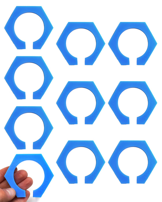 This 10-pack of collars helps protect 250mL graduated cylinders against breakage. Each collar fits snugly around cylinders with diameters of 42mm +/- 0.25mm. The hexagonal shape is ideal for preventing overturned cylinders from rolling away. Made of shock-absorbent ABS plastic, these collars measure 2.25 inches in length and width.