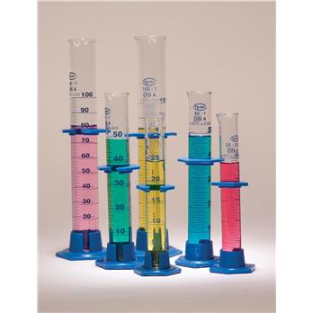Borosilicate glass cylinders with pour spouts feature heavy uniform wall tubing and a removeable, sturdy plastic base. All cylinders come with bumper guards. Single metric scale, accuracy per Class "B ".