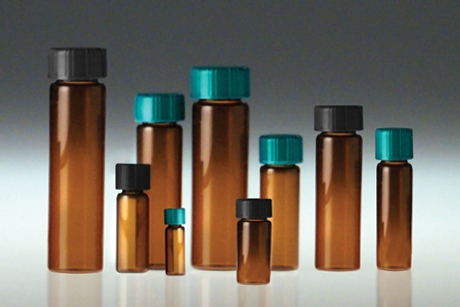 27.75 x 57mm 5 dram (20ml) Amber Borosilicate Vial with 24-400 Black Phenolic Rubber Lined Cap attached
