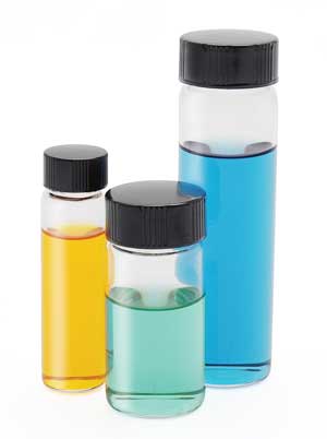 Clear glass sample vials, Packaged in corrugated trays with partitions, Closed-top black phenolic closures with PTFE-faced white rubber liners, attached, small case quantities