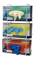 Here is the corrected text: Epoxy-coated steel wire racks hold most major brands of glove boxes. Choose from a single-box holder or a three-box holder. Steel wire racks are compatible with most major glove box brands. Supplied with wall-mounting screws. **Single-Box Holder:** Capacity: 1 Box Cat. No.: 89011-726 Dimensions: 14 × 10.2 × 20.8 cm (5½ × 4 × 8³⁄₁₆") **Three-Box Holder:** Capacity: 3 Boxes Cat. No.: 89011-728 Dimensions: 9.6 × 25 × 43.2 cm (3¾ × 9¹³⁄₁₆ × 17")