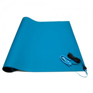 Blue ESD Soldering Mat Kits have two layers; the top one is a blue static dissipative rubber layer laminated to a black conductive rubber bottom layer. Resistance to ground and point-to-point is 1 x 103 – 105. This mat is ideal for use in ESD-safe workstations as table mats as well as floor mats. It offers excellent resistance to oil, grease and most common solvents. This mat is very light compared to our single layer and three layer mats. It complies with ANSI/ESD S20.20 and ESD 4.1 standards. Applications: aerospace assembly, electronic manufacturing, electronic repairs, fiber optics, hospitals, medical assembly and Soldering. It is heat and solder resistant, will not delaminate and easy to clean. Comes with a grounding cord (CGC151M) and wrist strap (WSADJSS). Blue Color.