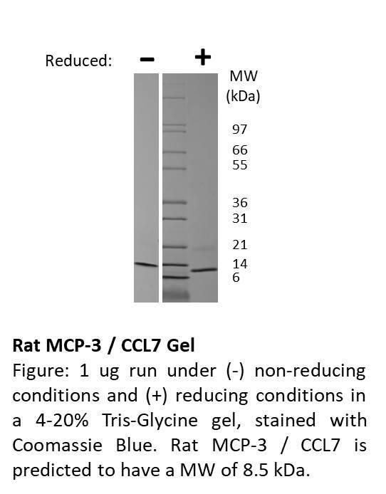 Rat Monocyte Chemoattractant Protein 3 (Mcp-3)^ Rat Monocyte Chemoattractant Protein 3 (Mcp-3), Non-Glycosylated Recombinant Protein, 75 Amino Acids, 8.6 Kda, Source: E. Coli, Purity: >/=98% (Hplc, Reducing And Non-Reducing Sds-Page, Uv Spectroscopy At 280 Nm), Synonymns: Ccl7, Marc, Size: 500Ug