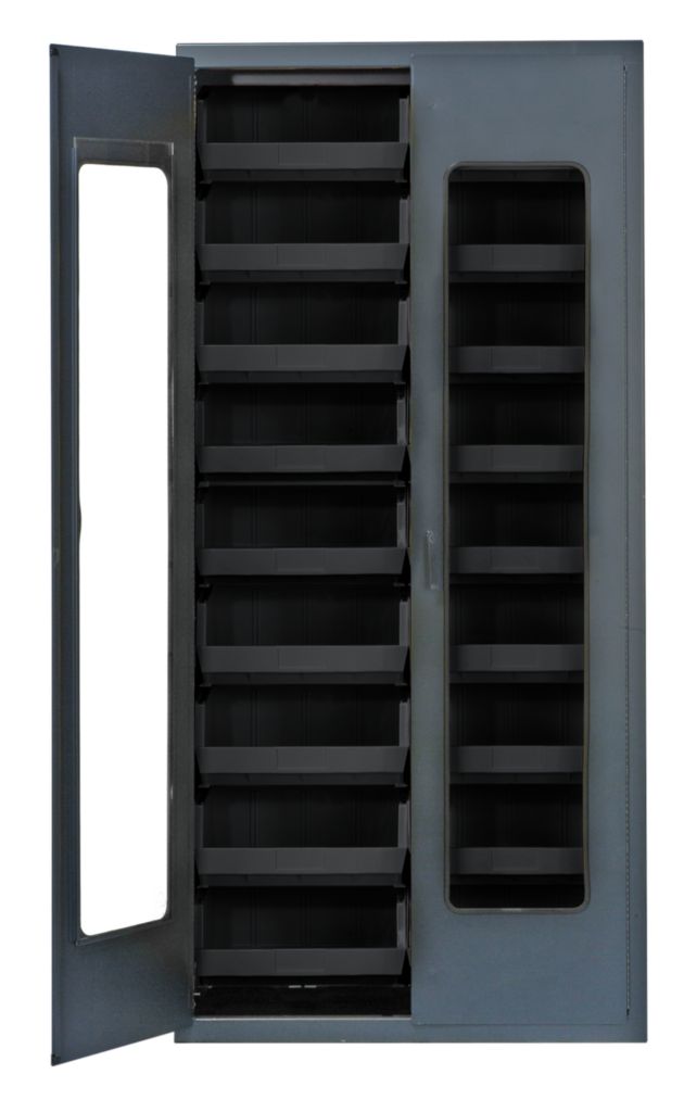 Clear-View Security Bin Locking Cabinet Black 36In^ Clear-View Security Bin Cabinet, With Black Bins, Features A Clear Door That Provides Visibility, Locking 14 Gauge Welded Gray Steel Cabinet With A 3-Point Locking Handle And Clear Door, With Two Keys No. Bins: 18, Outer Dimension: 36 X 18 X 78I