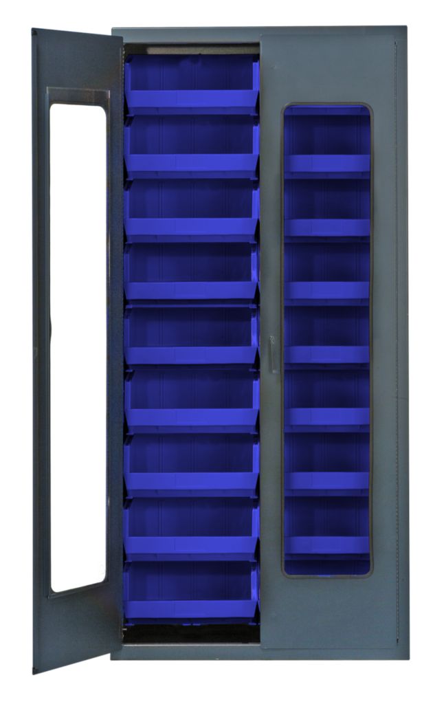 Clear-View Security Bin Locking Cabinet Blue 36In^ Clear-View Security Bin Cabinet, With Blue Bins, Features A Clear Door That Provides Visibility, Locking 14 Gauge Welded Gray Steel Cabinet With A 3-Point Locking Handle And Clear Door, With Two Keys No. Bins: 18, Outer Dimension: 36 X 18 X 78I