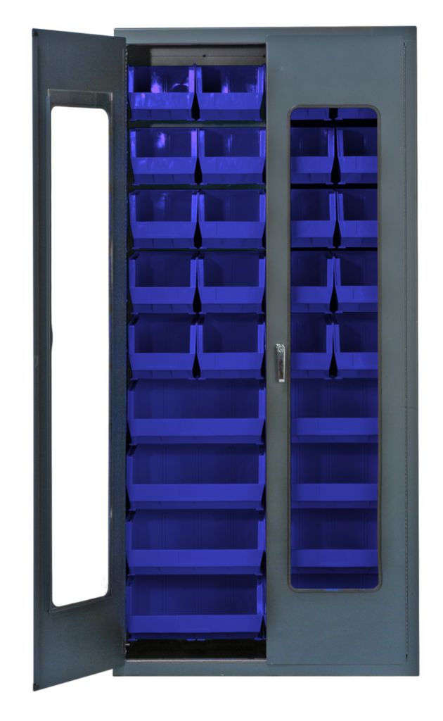 Clear-View Security Bin Locking Cabinet Blue 36In^ Clear-View Security Bin Cabinet, With Blue Bins, Features A Clear Door That Provides Visibility, Locking 14 Gauge Welded Gray Steel Cabinet With A 3-Point Locking Handle And Clear Door, With Two Keys No. Bins: 28, Outer Dimension: 36X18X78I