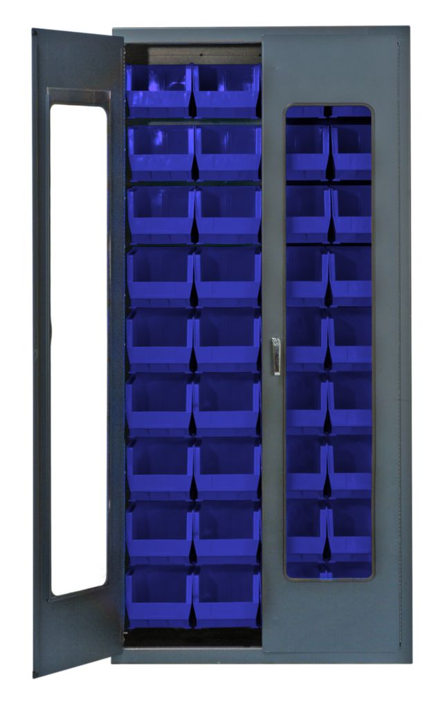 Clear-View Security Bin Locking Cabinet Blue 36In^ Clear-View Security Bin Cabinet, With Blue Bins, Features A Clear Door That Provides Visibility, Locking 14 Gauge Welded Gray Steel Cabinet With A 3-Point Locking Handle And Clear Door, With Two Keys No. Bins: 36, Outer Dimension: 36 X 18 X 78I