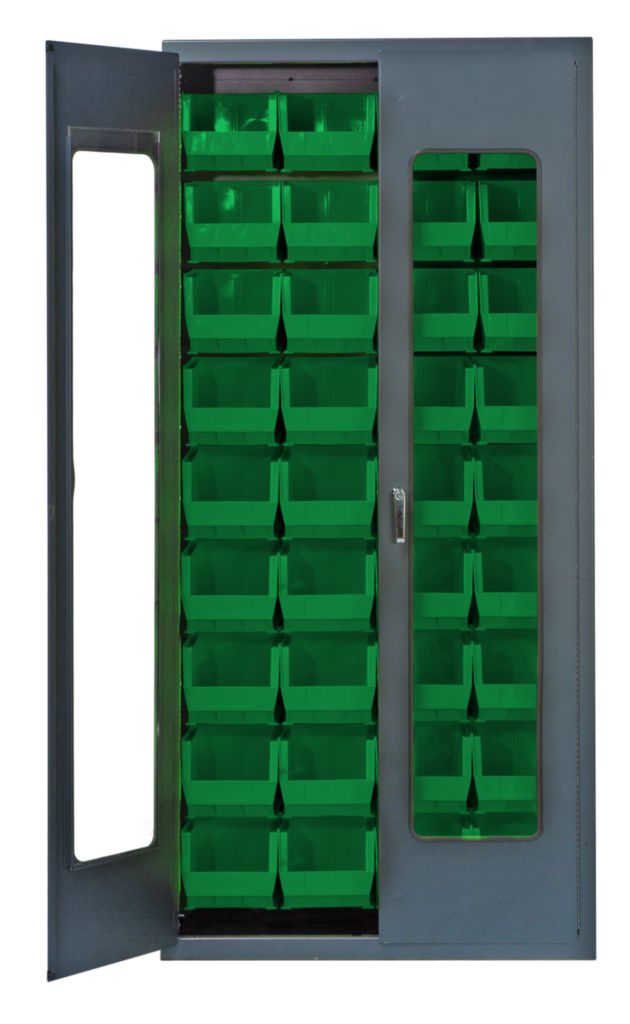 Clear-View Security Bin Locking Cabinet Green 36In^ Clear-View Security Bin Cabinet, With Green Bins, Features A Clear Door That Provides Visibility, Locking 14 Gauge Welded Gray Steel Cabinet With A 3-Point Locking Handle And Clear Door, With Two Keys No. Bins: 36, Outer Dimension: 36 X 18 X 78I
