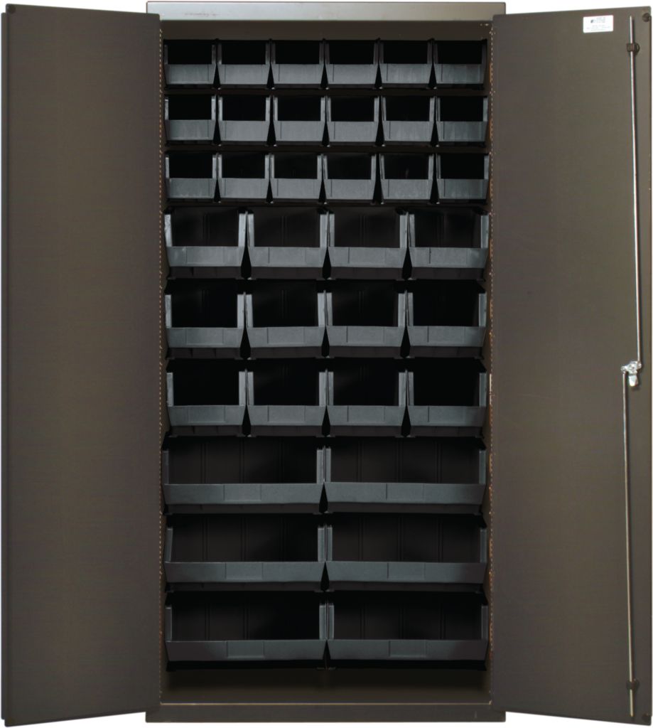 All-Welded Bin Cabinet Black 36In^ All-Welded Bin Cabinet, Flush Door, With Black Bin, 14 Gauge Steel Construction Increases Cabinet Strength, Security For Stored Contents With 3 Point Locking Handle And Key, Gray Baked Enamel Finish For Additional Strength, No. Bins: 36, Outer Dimension: 36X18X72I