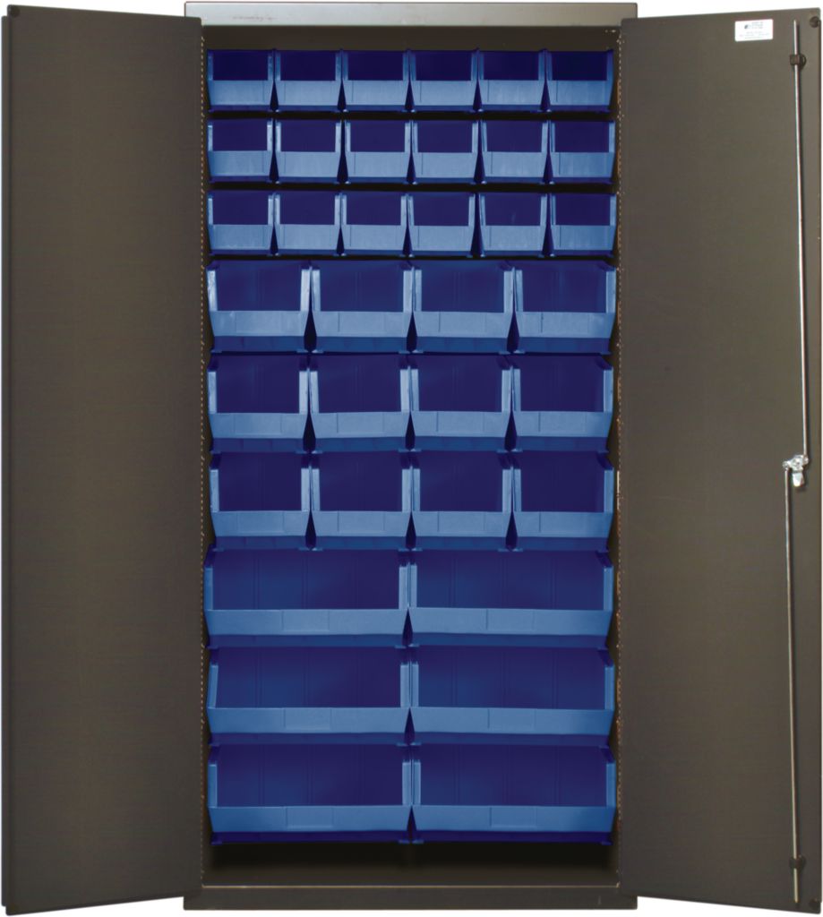 All-Welded Bin Cabinet Blue 36In^ All-Welded Bin Cabinet, Flush Door, With Blue Bin, 14 Gauge Steel Construction Increases Cabinet Strength, Security For Stored Contents With 3 Point Locking Handle And Keys, Gray Baked Enamel Finish For Additional Strength, No. Bins: 36, Outer Dimension: 36X18X72I