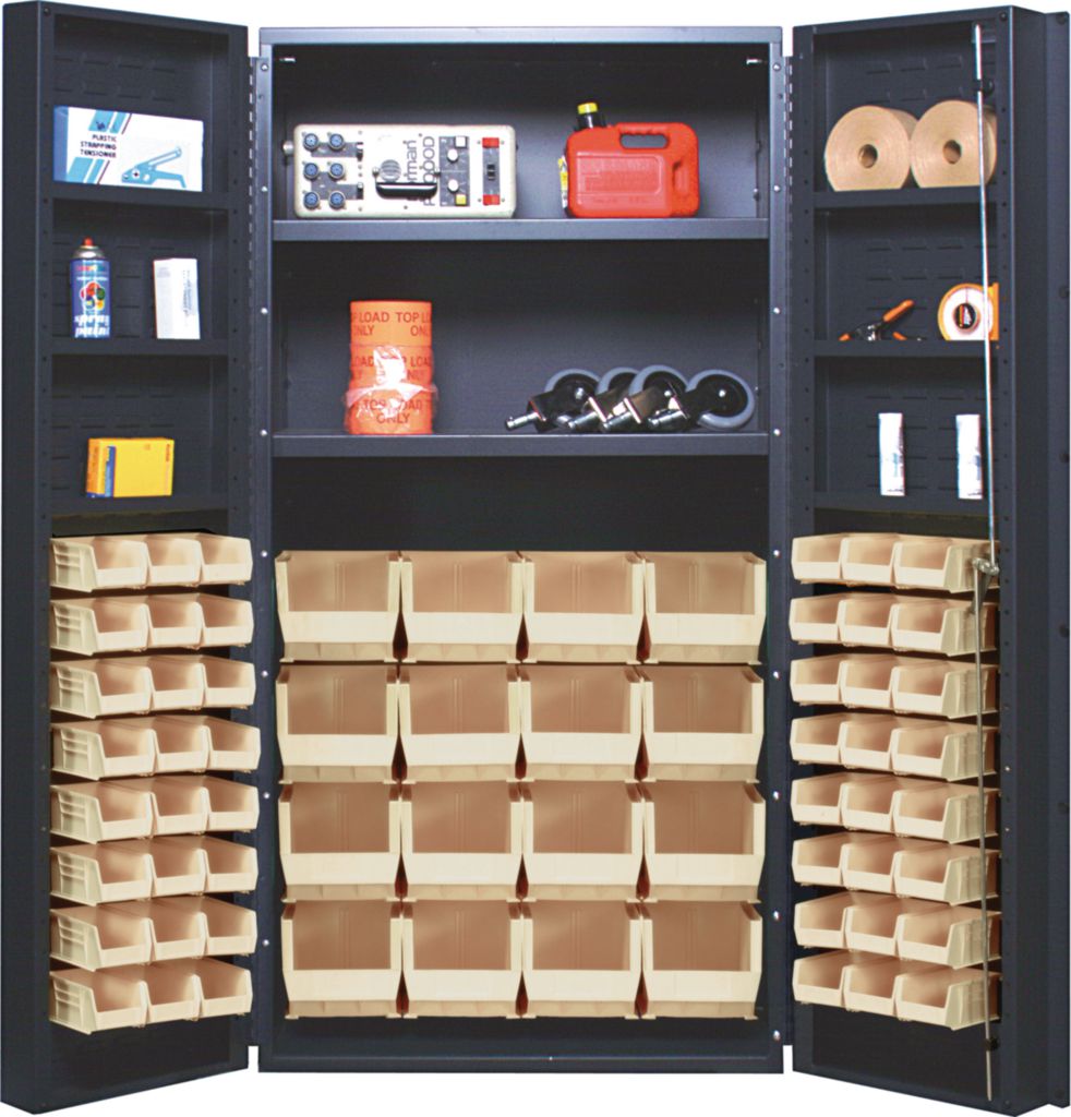 All-Welded Bin Cabinet Ivory 36In^ All-Welded Bin Locking Cabinet, With Ivory Bins, 14 Gauge Steel Construction Increases Cabinet Strength, Provides Security For Stored Contents With Three Point Locking Handle And Keys, With 3 Point Locking Handle And Keys, No. Bins 64, Outer Dimension: 36X24X72I