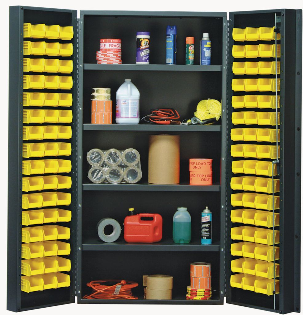 All-Welded Bin Cabinet With Yellow Bins 36In^ All-Welded Bin Locking Cabinet, With Yellow Bins, Three Point Locking Handle And Keys Increase Cabinet Security, With Four Adjustable Shelves, 14 Gauge Steel Construction Increases Cabinet Strength, Number Of Bins: 96, Outer Dimension: 36 X 24 X 72I