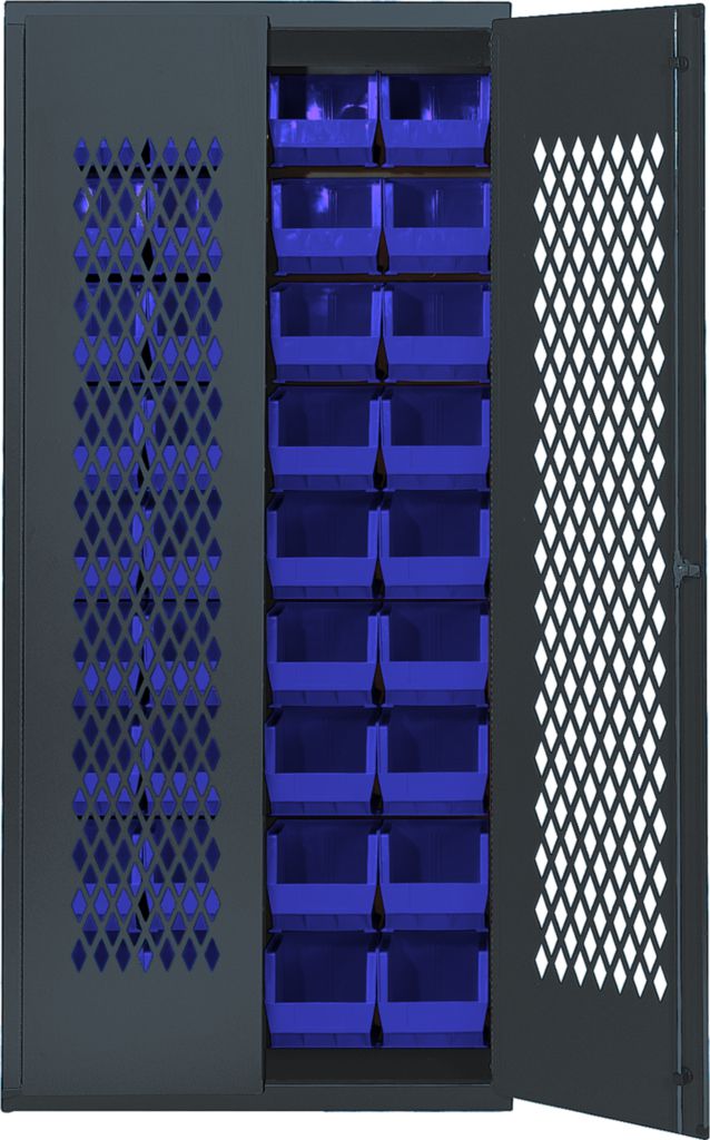Specialty Bin Locking Cabinet Blue 36In^ Specialty Bin Cabinet, With Blue Plastic Bins, Louvered Back Wall Fitting, Mesh Security Doors, Locking 14 Gauge Welded Gray Steel Cabinet With A 3-Point Locking Handle And Clear Door, With Two Keys, No. Of Bins: 36, Outer Dimension: 36 X 18 X 78I