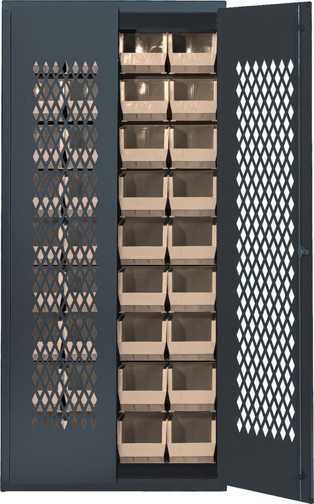 Specialty Bin Locking Cabinet Ivory 36In^ Specialty Bin Cabinet, With Ivory Plastic Bins, Louvered Back Wall Fitting, Mesh Security Doors, Locking 14 Gauge Welded Gray Steel Cabinet With A 3-Point Locking Handle And Clear Door, With Two Keys, No. Of Bins: 36, Outer Dimension: 36 X 18 X 78I