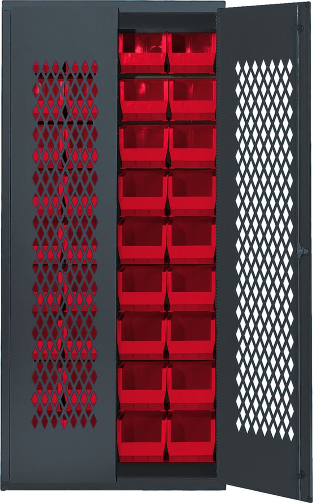 Specialty Bin Locking Cabinet Red 36 In^ Specialty Bin Cabinet, With Red Plastic Bins, Louvered Back Wall Fitting, Mesh Security Doors, Locking 14 Gauge Welded Gray Steel Cabinet With A 3-Point Locking Handle And Clear Door, With Two Keys, No. Of Bins: 36, Outer Dimension: 36In X 18In X 78I