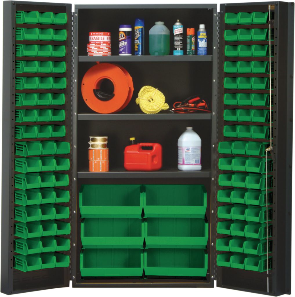 All-Welded Bin Cabinet Green 36In^ All-Welded Bin Cabinet, Locking Shelf, With Green Bins, 3-Point Locking Doors With Keys For Extra Security, 14 Gauge Construction Increase Unit Strength, Gray Baked Enamel Finish For Heavy-Duty Use, 3 Adjustable Shelves, No. Bins: 102, Outer Dimension: 36X24X72 I