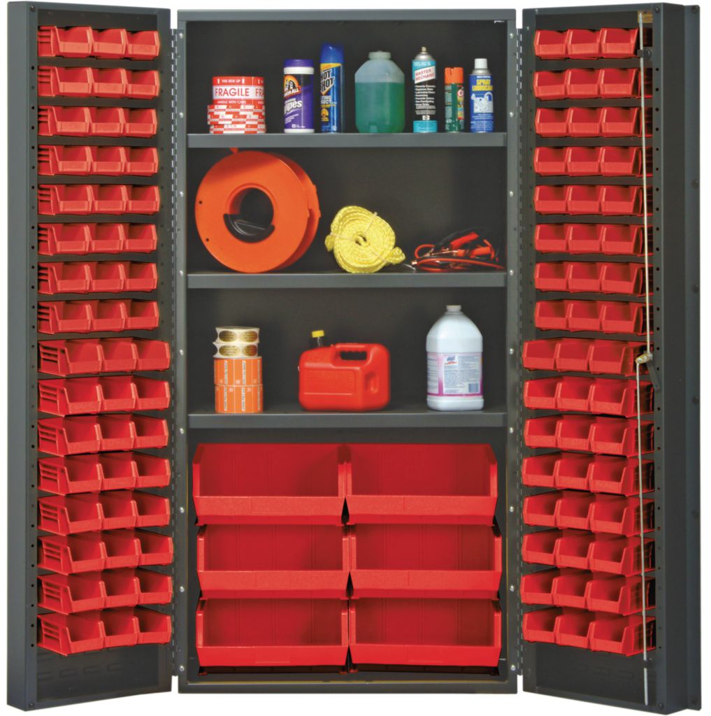 All-Welded Bin Cabinet Red 36In^ All-Welded Bin Cabinet, Locking Shelf, With Red Bins, 3-Point Locking Doors With Keys For Extra Security, 14 Gauge Construction Increase Unit Strength, Gray Baked Enamel Finish For Heavy-Duty Use, 3 Adjustable Shelves, No. Bins: 102, Outer Dimension: 36X24X72 I