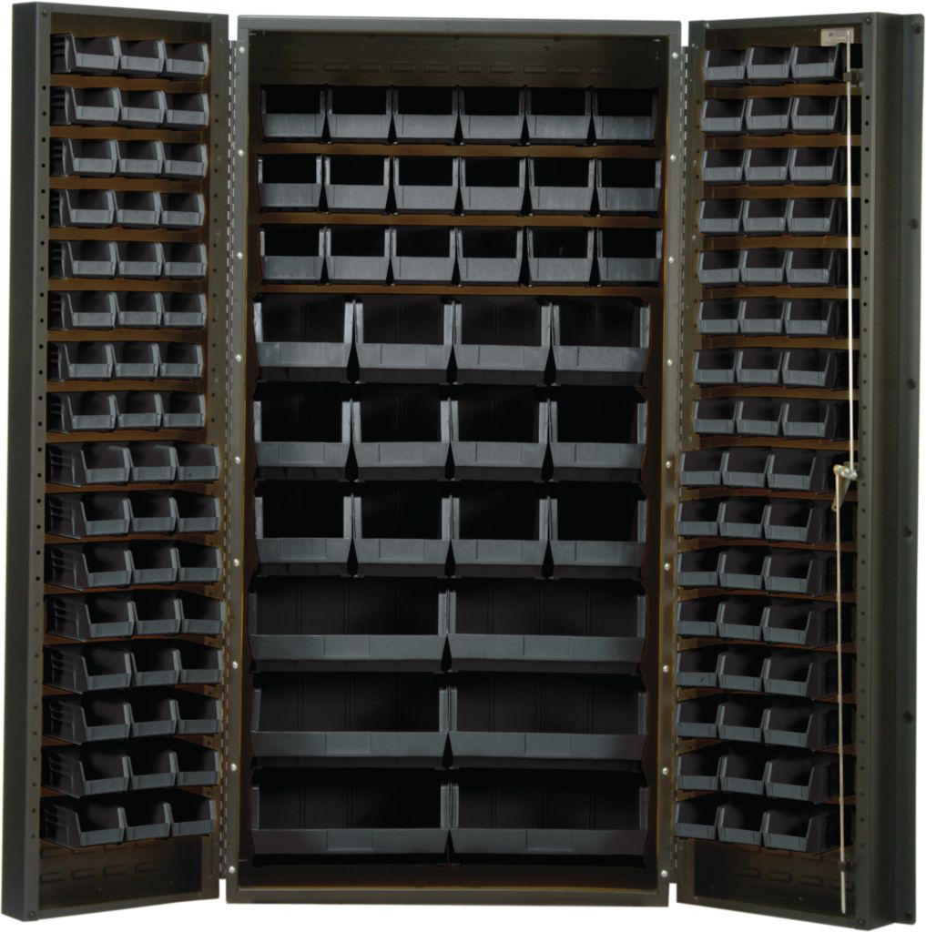 All-Welded Bin Cabinet Black 36In^ All-Welded Bin Cabinet, Locking Steel, With Black Bins, Features 3-Point Locking Doors With Keys For Extra Security, 14 Gauge All-Welded Construction Increase Unit Strength, Gray Baked Enamel Finish For Heavy-Duty Use, No. Bins: 132, Outer Dimension: 36 X 24 X 72I