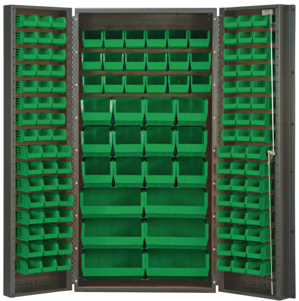 All-Welded Bin Cabinet Green 36In^ All-Welded Bin Cabinet, Locking Steel, With Green Bins, Features 3-Point Locking Doors With Keys For Extra Security, 14 Gauge All-Welded Construction Increase Unit Strength, Gray Baked Enamel Finish For Heavy-Duty Use, No. Bins: 132, Outer Dimension: 36 X 24 X 72I