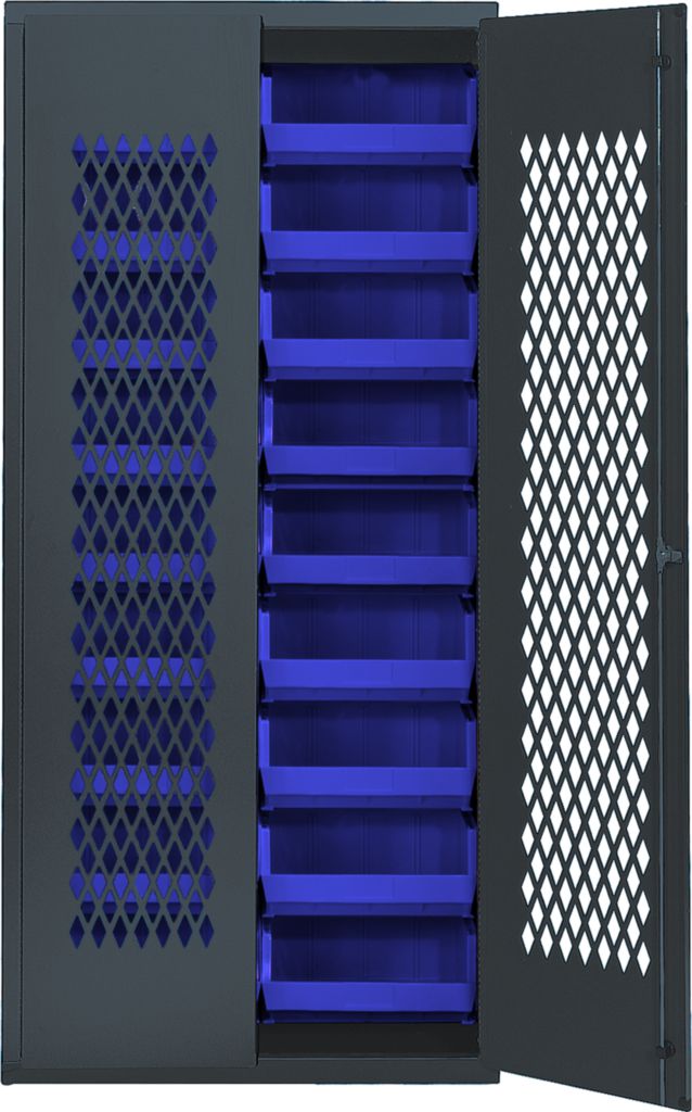 Specialty Bin Cabinet Blue 36In^ Specialty Bin Cabinet, With Blue Plastic Bins, Louvered Back Wall Fitting, Mesh Security Doors For High Visibility, High Volume Storage Unit And 3 Point Locking Handle, With 2 Keys, And 14In Gauge Cabinet, No. Of Bins: 36, Outer Dimension: 36In X 18In X 78I