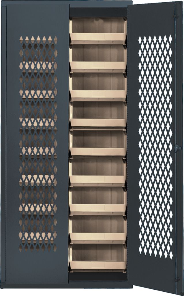Specialty Bin Cabinet Ivory 36In^ Specialty Bin Cabinet, With Ivory Plastic Bins, Louvered Back Wall Fitting, Mesh Security Doors For High Visibility, High Volume Storage Unit And 3 Point Locking Handle, With 2 Keys, And 14In Gauge Cabinet, No. Of Bins: 36, Outer Dimension: 36In X 18In X 78I