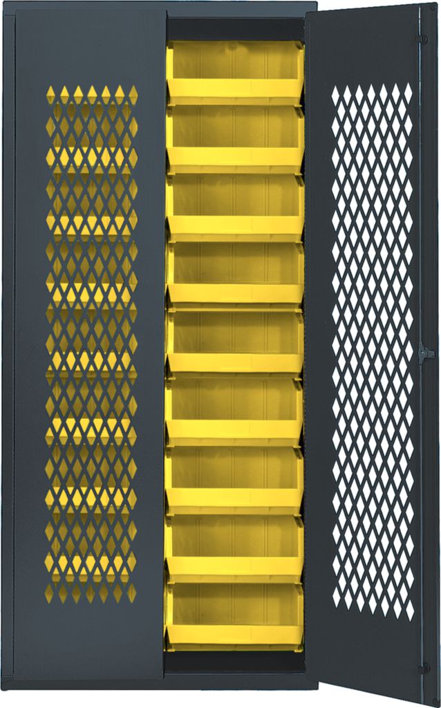 Specialty Bin Cabinet Yellow 36In^ Specialty Bin Cabinet, With Yellow Plastic Bins, Louvered Back Wall Fitting, Mesh Security Doors For High Visibility, High Volume Storage Unit And 3 Point Locking Handle, With 2 Keys, And 14In Gauge Cabinet, No. Of Bins: 36, Outer Dimension: 36In X 18In X 78I